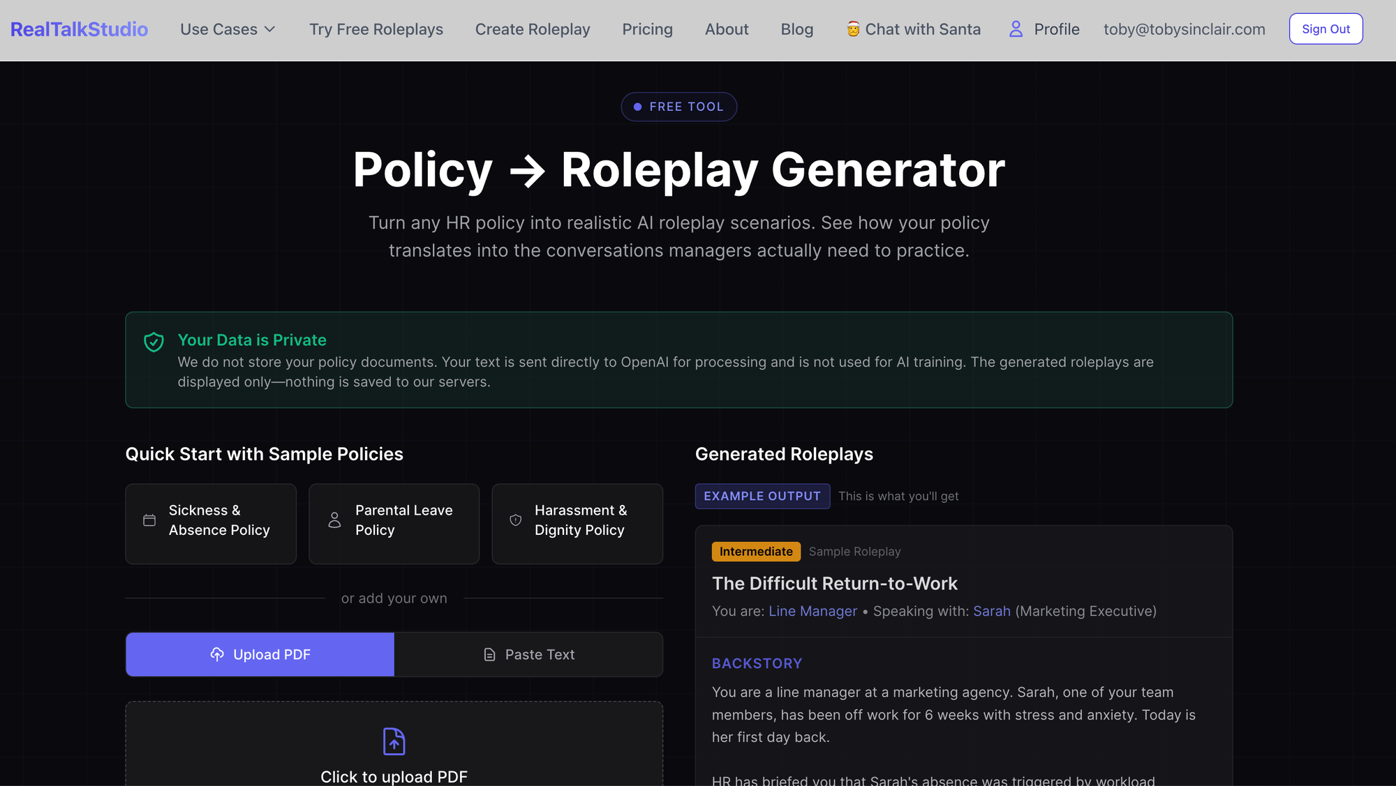 Leading the charge in this space is Real Talk Studio, which allows you to bring your static policy documents to life with AI video roleplay. The process bypasses the need for expensive video production or actors.